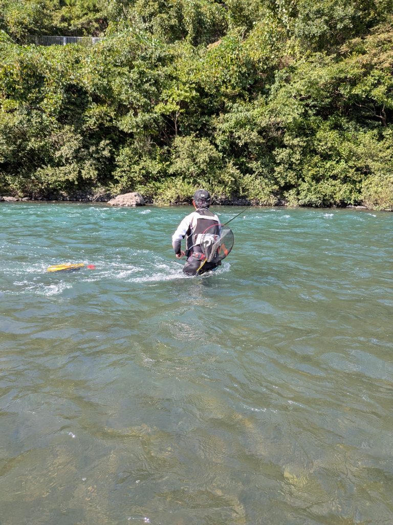 増水して鮎の居るポイントは対岸のオトリ鮎が送り込めるか否かのキワキワのシワシワなのです。