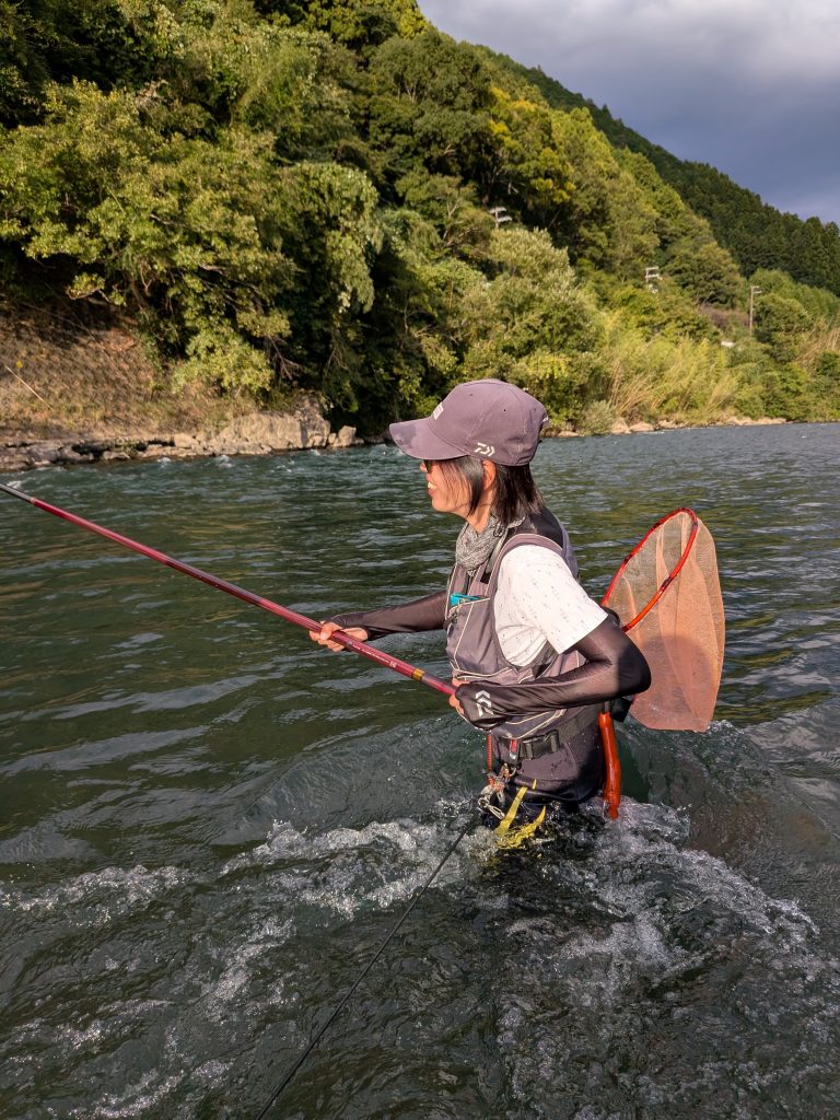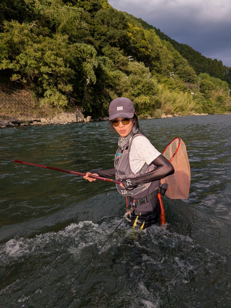 強い流れに負けないようにオトリ鮎をいち早く送り込み数少ないチャンスをものにするというスリリングな所作を、このスレンダーな三子は果敢に挑んで‥‥‥、いやドヤ顔で楽しんでいたのであります。